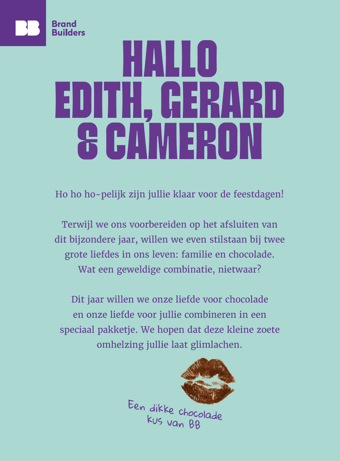Aangezien chocolade en familie twee grote liefdes zijn, is dit niet moeilijk te combineren. Door op een grappige en creatieve manier met de chocolade om te gaan en iedereen hiermee te portretteren heb ik een concept gecreëerd die niet alleen de ouders maar ook ons zelf heeft doen lachen. Dit past bij Brand Builders en geeft iedereen even een luchtige onderbreking in de voorbereiding van de feestdagen.